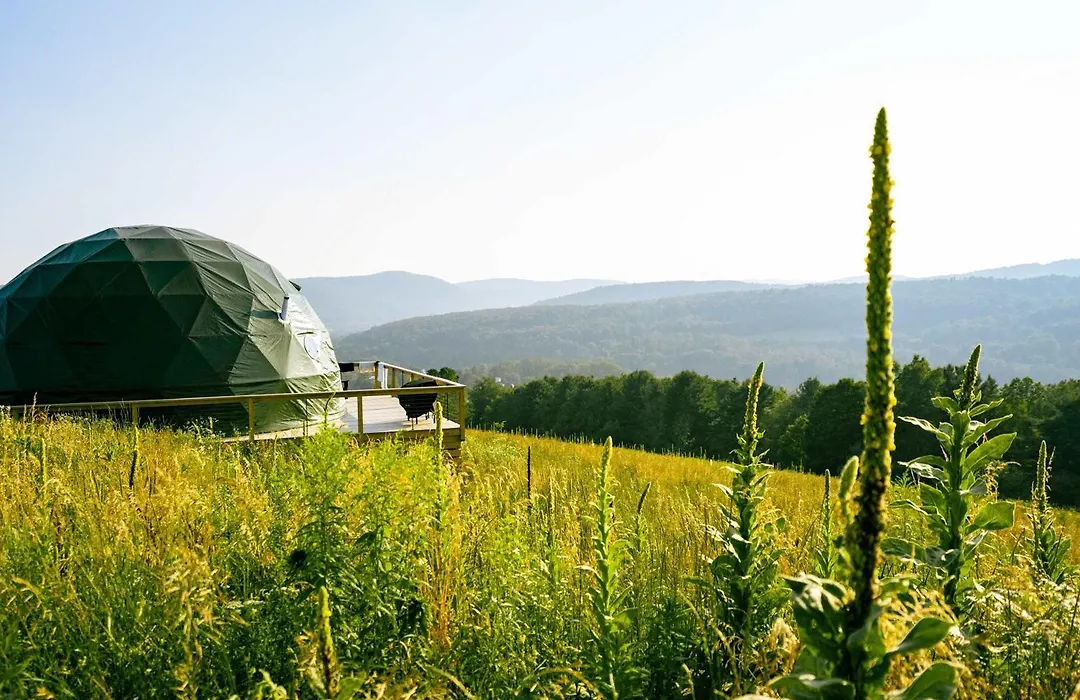 La villa Catskills Glamping At 'The Deer Dome' In Franklin dispose d'un réfrigérateur, d'une table de cuisson et de la vaisselle dans une cuisine équipée pour préparer vos repas. Vous trouverez The Tulip and the Rose Cafe à seulement 1 km.